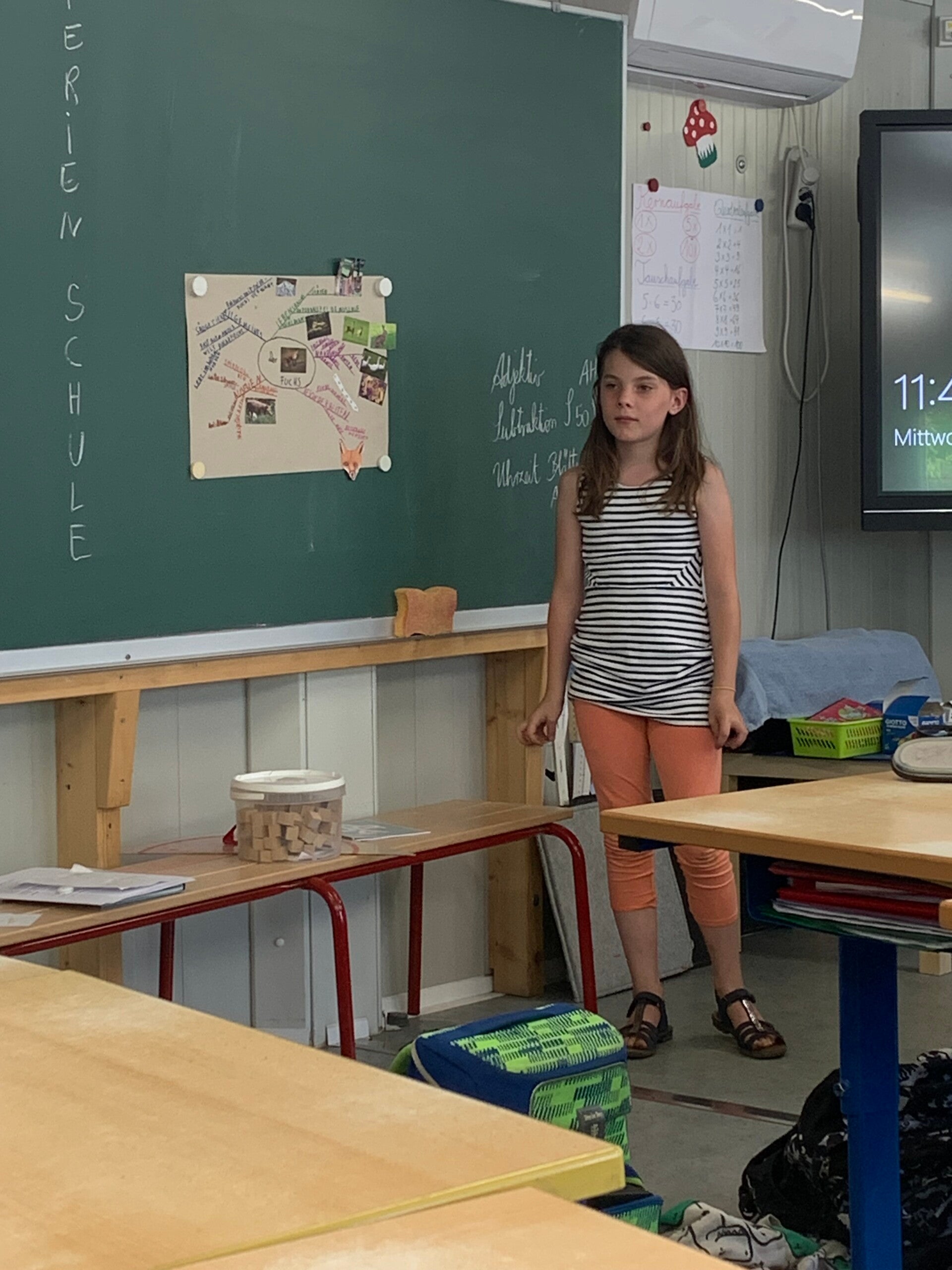 Morgens kommen wir in die Klasse und hängen unsere Jacken auf. Wir stellen unseren Stuhl runter und schreiben auf, wenn wir essen bleiben. Wir machen ein Kreuz, wenn wir warm essen bleiben und wenn wir Brote essen bleiben, machen wir ein B.