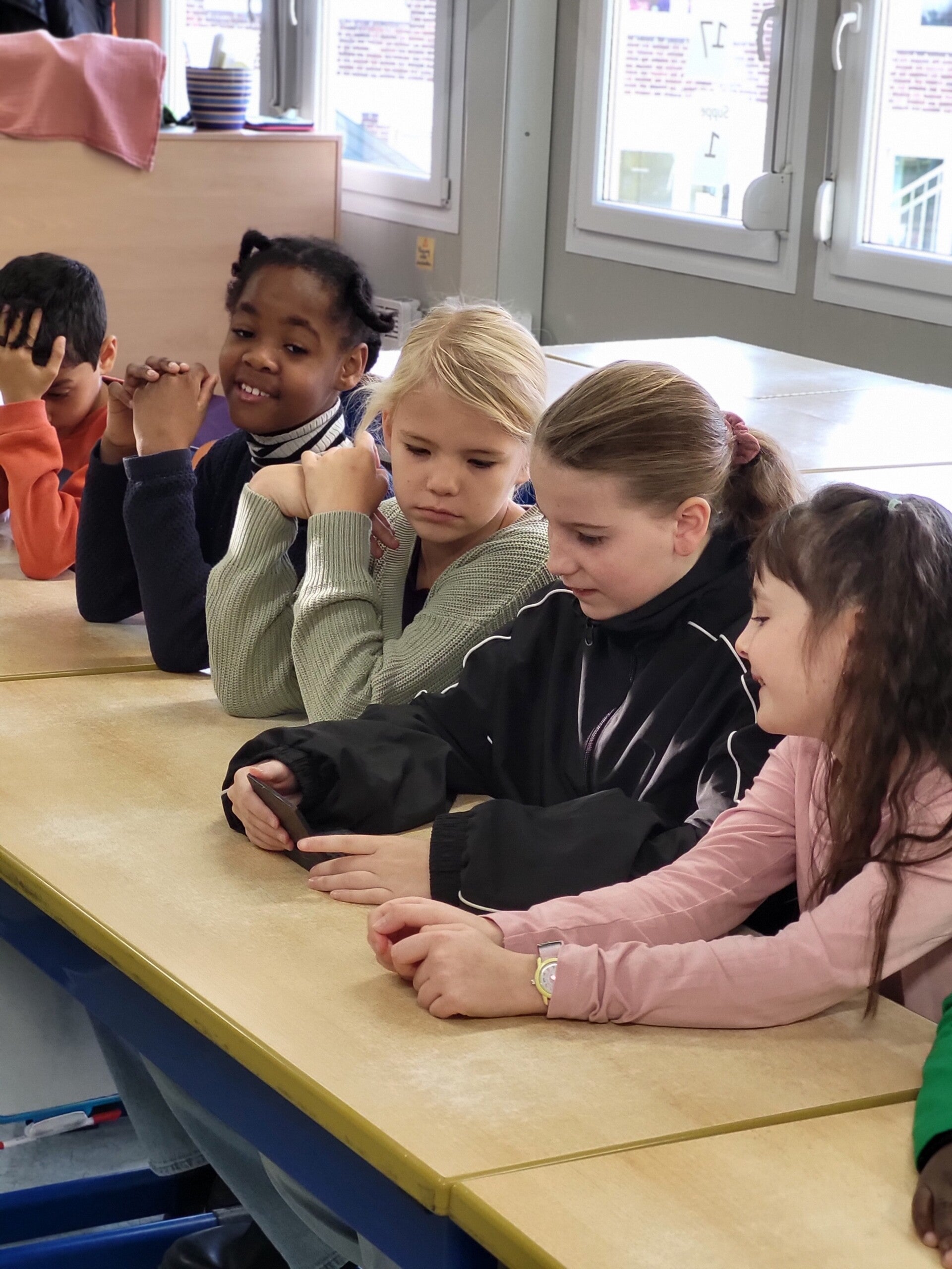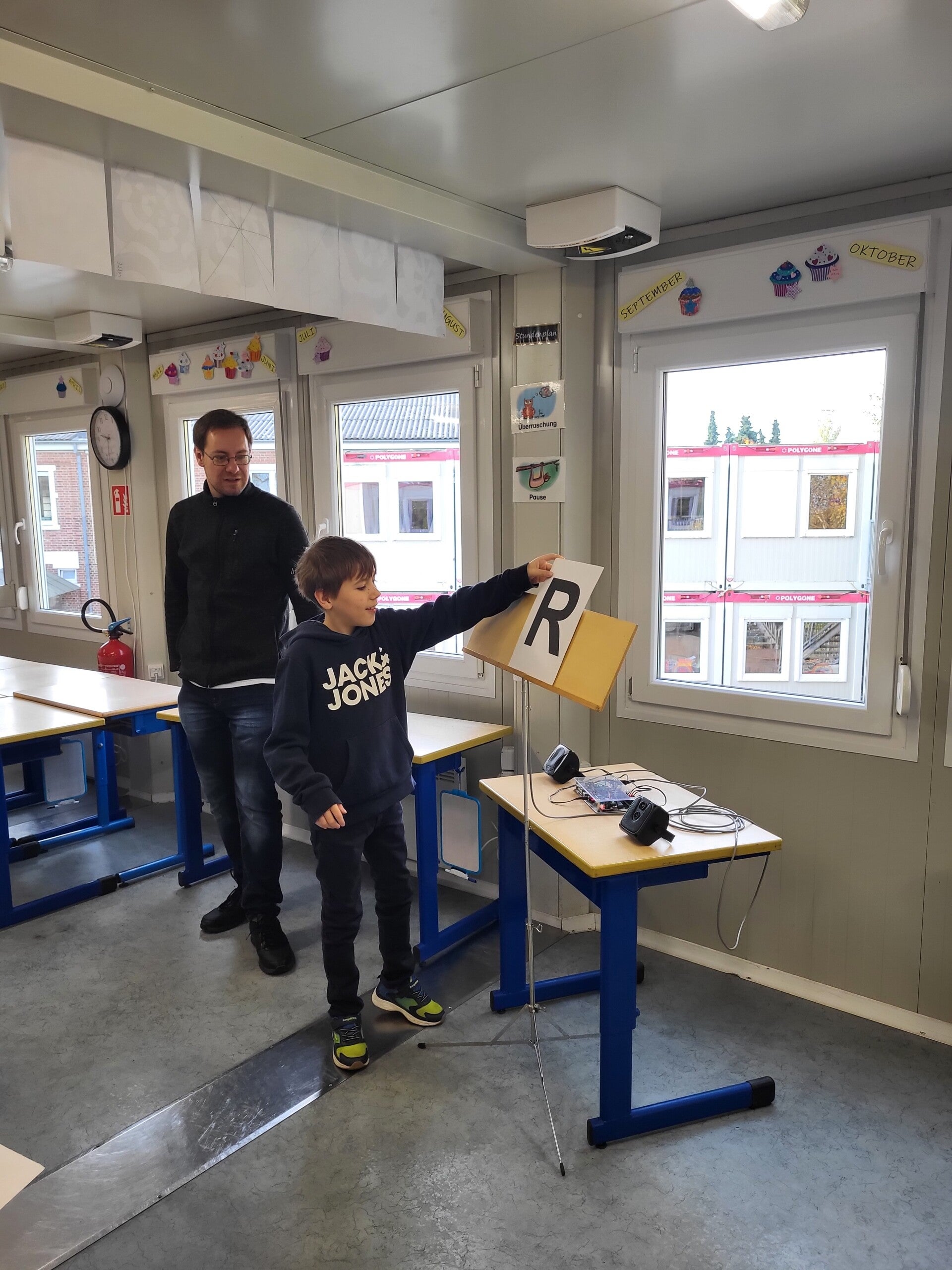 Wir haben eine Containerklasse. Unsere Klasse ist oben rechts. Wenn man in die Klasse kommt, sieht man auf der gegenüberliegenden Seite die Klassenregeln. Es gibt auch eine elektronische Tafel, Comicexplosionen als Namenschilder und Muffins als Geburtstagskalender.