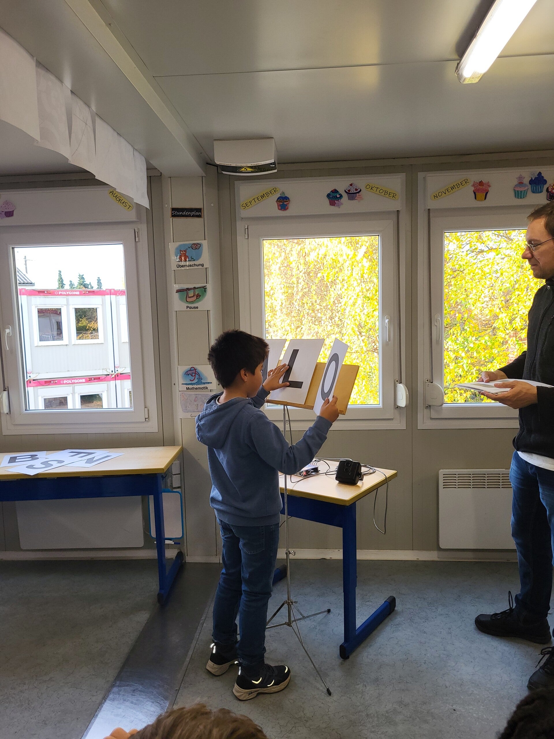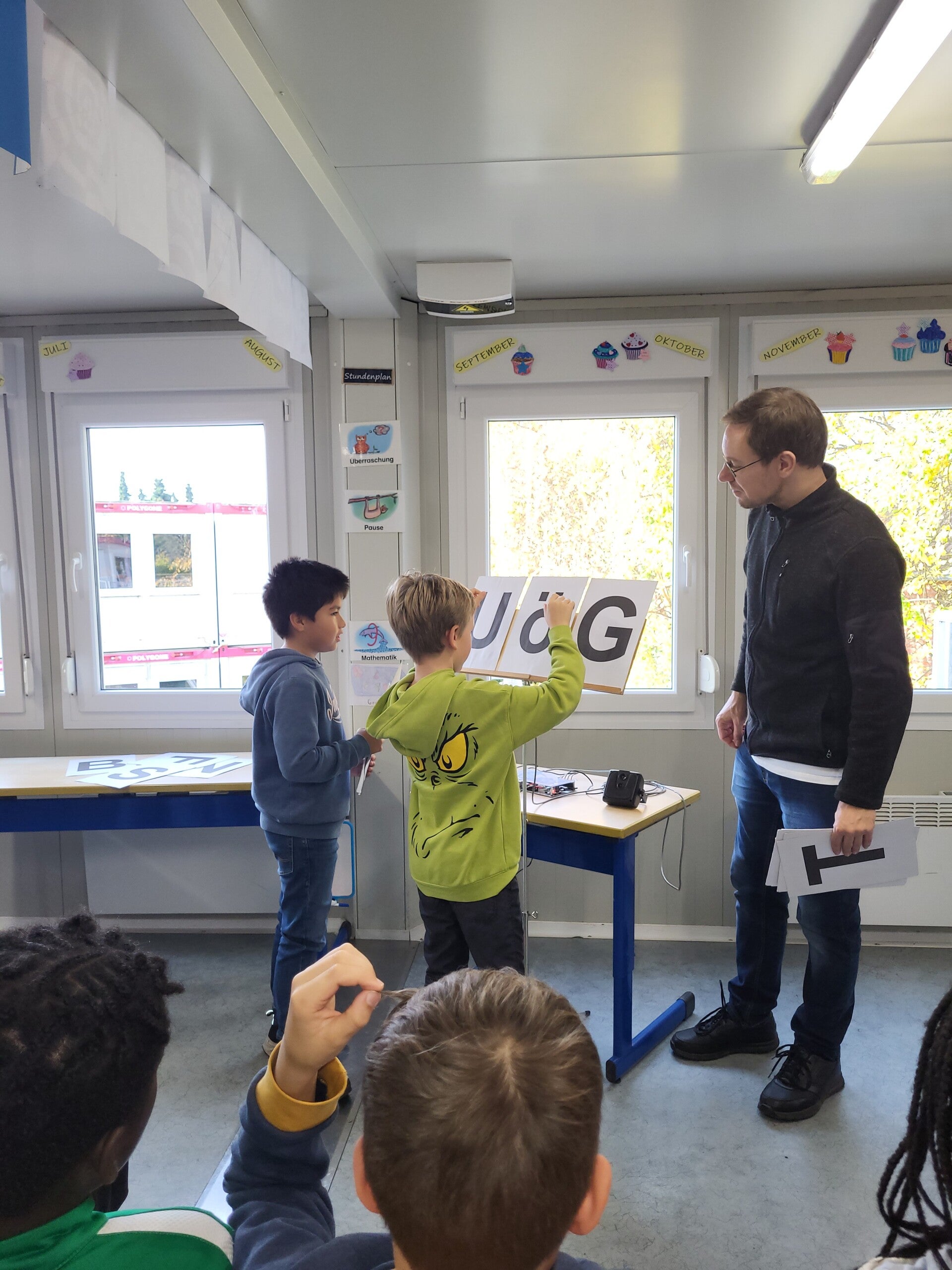 In unsere Klasse ist Frau Baumsteiger gekommen. Sie hilft uns, eine bessere Klassengemeinschaft zu werden. Das finden wir ganz gut. Seitdem ist es in unserer Klasse ein bisschen harmonischer geworden. Sie hat uns Zahlen an die Tafel gehängt von 1 bis 10. Im Moment sind wir auf 7. Das ist gut!